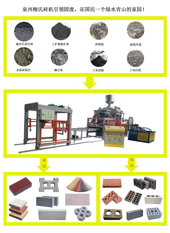(3)固廢制磚,可以按材料性質(zhì)及配比來選擇不同的機型。一般含泥量比較高的就采用液壓磚機來生產(chǎn),含泥量不高的,首先免托板磚機,次之才選擇帶托板的水泥免燒磚機;當然了,有制作彩磚、路面磚的還是選擇單壓液壓磚機會好點!如果猶豫不定選擇什么類型的水泥免燒磚機的話,可以先咨詢?nèi)萘洗u機涂先生或者帶上制作原材料,來泉州柳氏磚機做個試驗!